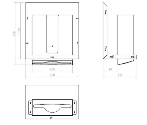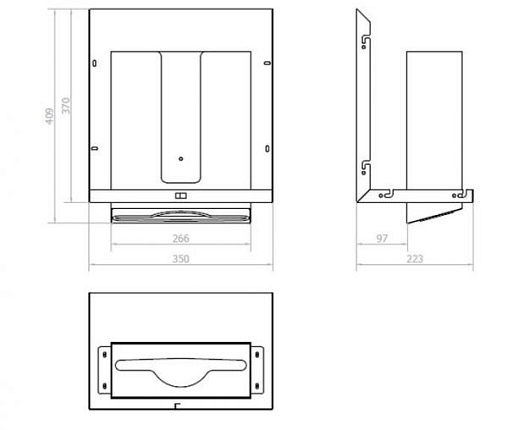 Прямоугольный диспенсер для листовых бумажных полотенец открытого типа с верхней загрузкой, вместимостью 400-600 листов любого типа сложения.
