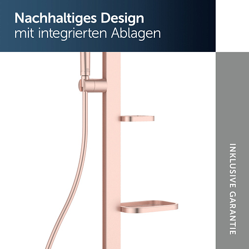 ALU+ Душевая система в комплекте с однорукоятковым смесителем для душа (монтаж на стандартных эксцентриках, керамический картридж FirmaFlow 38 мм с функцией HWTC (ограничение максимальной температуры горячей воды), интегрированный в корпус 2-функциональный керамический переключатель, технология "Cool body" ("Холодный корпус"), обратный клапан); штанга с направляющими справа и слева для установки держателя и полок по выбору при первичном монтаже; держатель лейки с регулируемым углом наклона; свободная высота регулировки кронштейна крепления к стене; круглый 2-функциональный верхний душ 260 мм, ограничение потока 12 л/мин., 2-функциональная душевая лейка 100 мм с ограничением потока 8 л/мин., маленькая полочка 130 мм (макс. нагрузка 7кг), большая полочка 208 мм (макс. нагрузка 7кг), шланг 1750 мм Idealflex