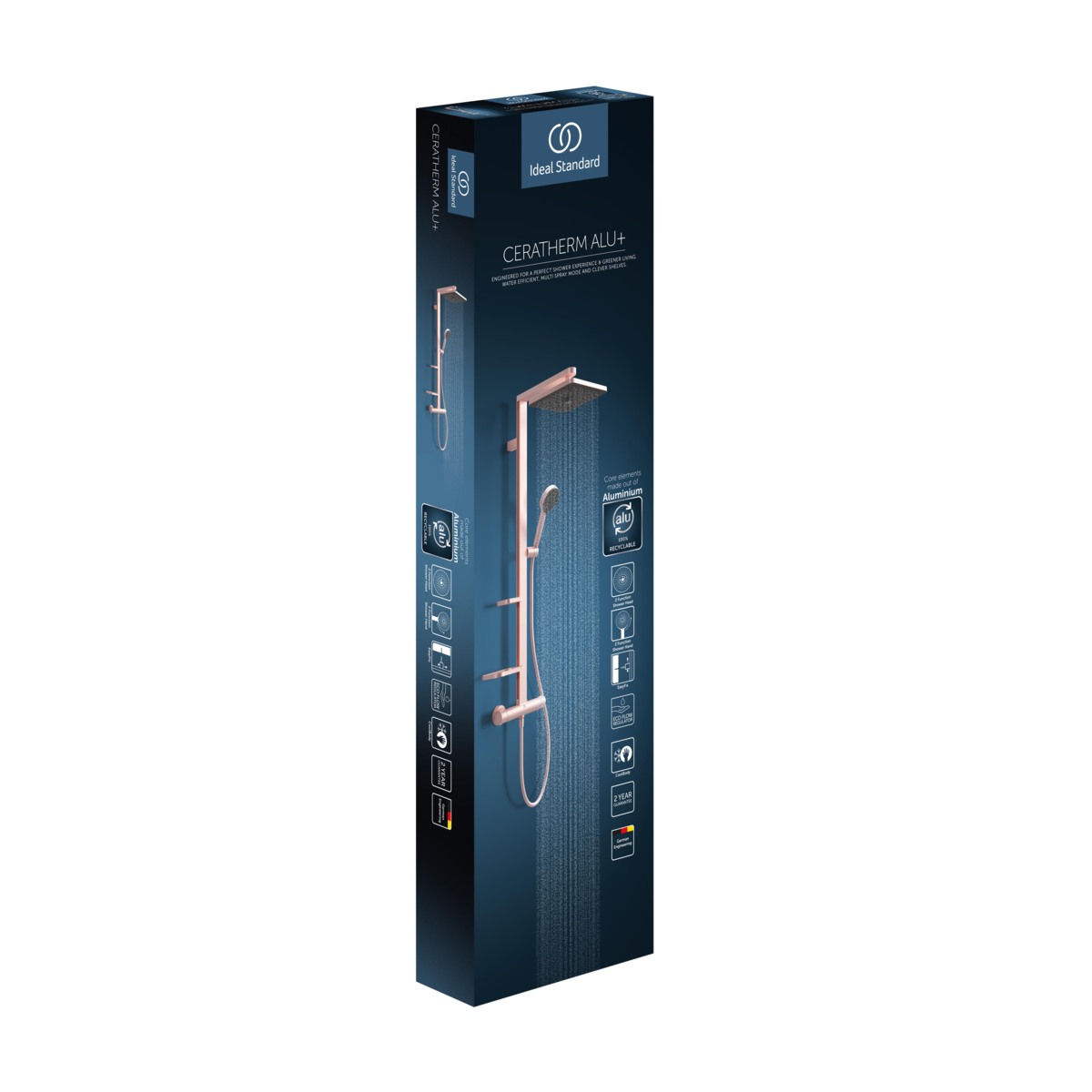 ALU+ Душевая система в комплекте с термостатическим смесителем для душа. Монтаж на стандартных эксцентриках, термостатический картридж PreciTherm®, затворы на керамических дисках G1/2 90˚, технология «Cool body» («Холодный корпус»), пластиковые рукоятки с ограничителями температуры (40ºC) и потока воды (50%), встроенные обратные клапаны. Штанга с направляющими справа и слева для установки держателя и полок по выбору при первичном монтаже. Держатель лейки с регулируемым углом наклона; свободная высота регулировки кронштейна крепления к стене. Квадратный 2-функциональный верхний душ 260х260 мм, ограничение потока 12 л/мин. 2-функциональная душевая лейка 100 мм с ограничением потока 8 л/мин. Маленькая полочка 130 мм (макс. нагрузка 7кг), большая полочка 208 мм (макс. нагрузка 7кг). Шланг 1750 мм Idealflex