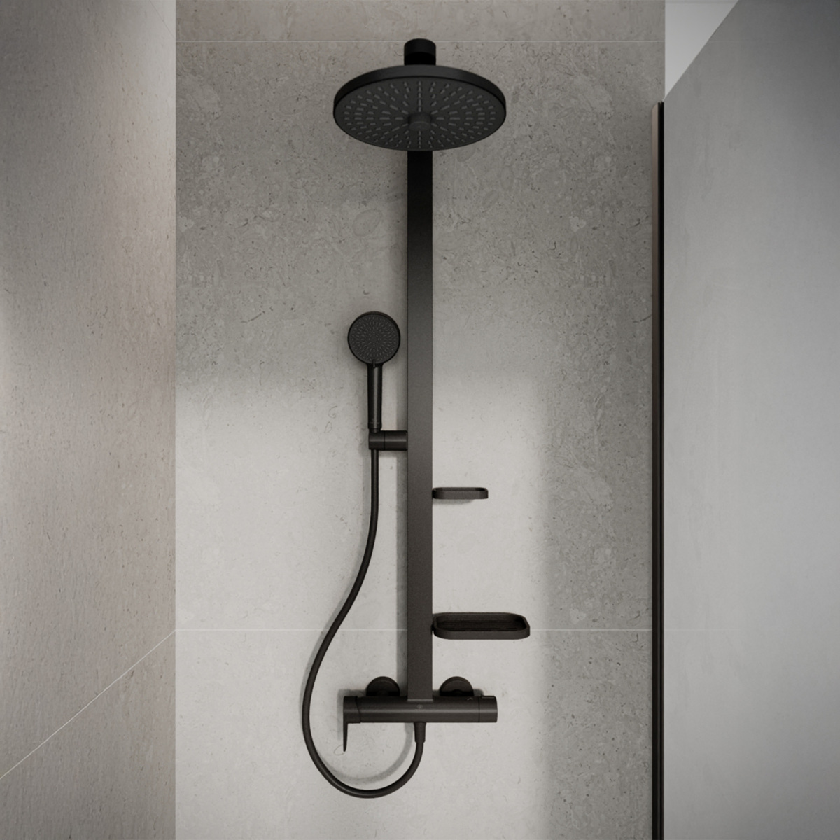 ALU+ Душевая система в комплекте с однорукоятковым смесителем для душа (монтаж на стандартных эксцентриках, керамический картридж FirmaFlow 38 мм с функцией HWTC (ограничение максимальной температуры горячей воды), интегрированный в корпус 2-функциональный керамический переключатель, технология "Cool body" ("Холодный корпус"), обратный клапан); штанга с направляющими справа и слева для установки держателя и полок по выбору при первичном монтаже; держатель лейки с регулируемым углом наклона; свободная высота регулировки кронштейна крепления к стене; круглый 2-функциональный верхний душ 260 мм, ограничение потока 12 л/мин., 2-функциональная душевая лейка 100 мм с ограничением потока 8 л/мин., маленькая полочка 130 мм (макс. нагрузка 7кг), большая полочка 208 мм (макс. нагрузка 7кг), шланг 1750 мм Idealflex