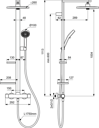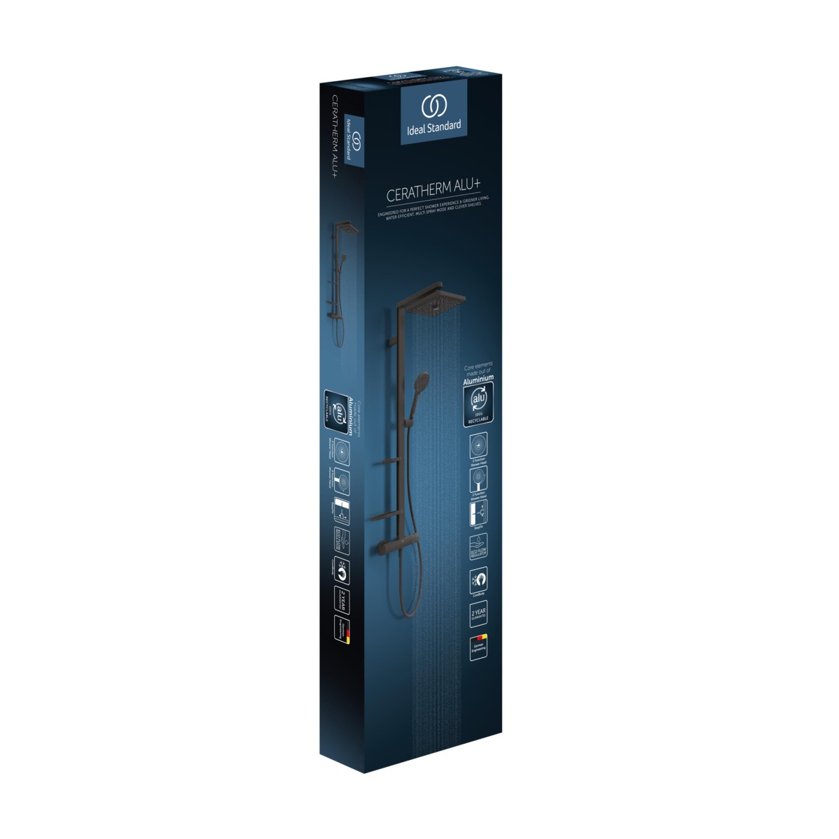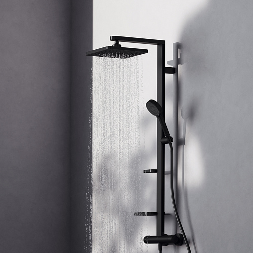 ALU+ Душевая система в комплекте с термостатическим смесителем для душа. Монтаж на стандартных эксцентриках, термостатический картридж PreciTherm®, затворы на керамических дисках G1/2 90˚, технология «Cool body» («Холодный корпус»), пластиковые рукоятки с ограничителями температуры (40ºC) и потока воды (50%), встроенные обратные клапаны. Штанга с направляющими справа и слева для установки держателя и полок по выбору при первичном монтаже. Держатель лейки с регулируемым углом наклона; свободная высота регулировки кронштейна крепления к стене. Квадратный 2-функциональный верхний душ 260х260 мм, ограничение потока 12 л/мин. 2-функциональная душевая лейка 100 мм с ограничением потока 8 л/мин. Маленькая полочка 130 мм (макс. нагрузка 7кг), большая полочка 208 мм (макс. нагрузка 7кг). Шланг 1750 мм Idealflex