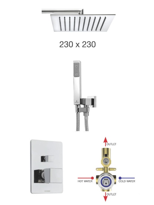 Cosmo, готовый набор для душа (без излива), 1 режим верхней лейки, 1 режим ручной лейки, 23 см, square, 2 функции, easy-clean, арт. M00754.030, Bossini