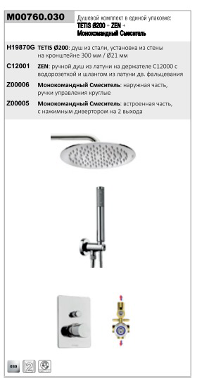 Tetis, готовый набор для душа (без излива), 1 режим верхней лейки, 1 режим ручной лейки, 20 см, round, 2 функции, арт. M00760.030, Bossini