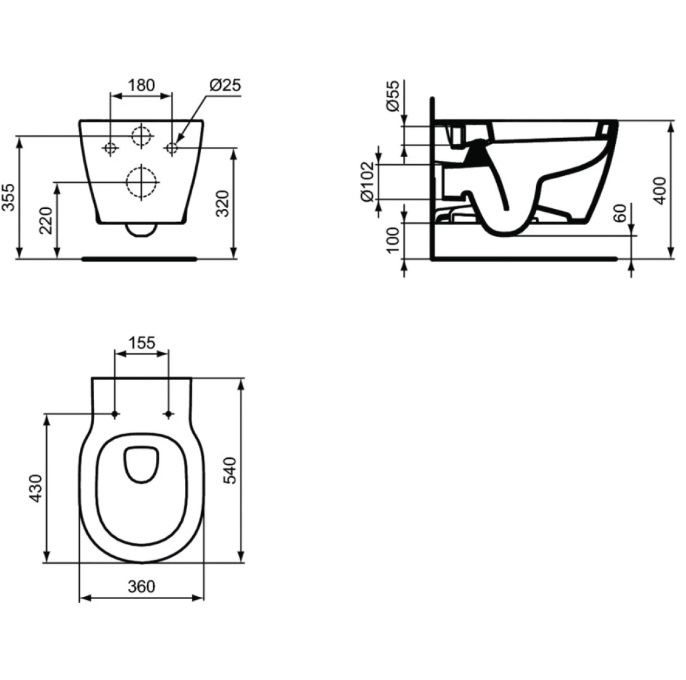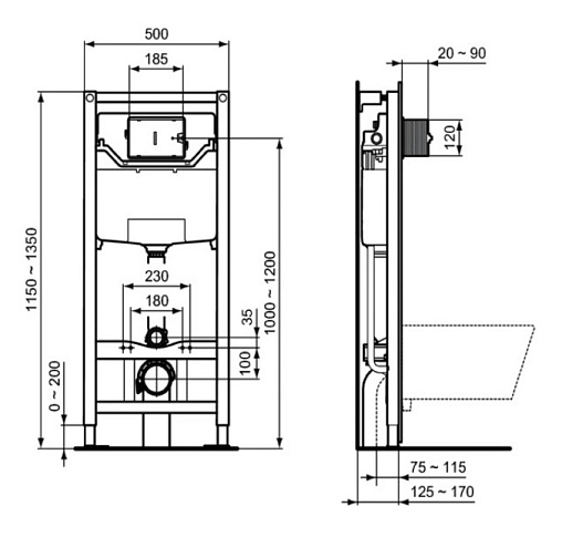 Комплект унитаза с инсталляцией Connect глубина унитаза 54см, без клавиши в комплекте, с микролифтом, безободковый, быстросъемное, Ideal Standard