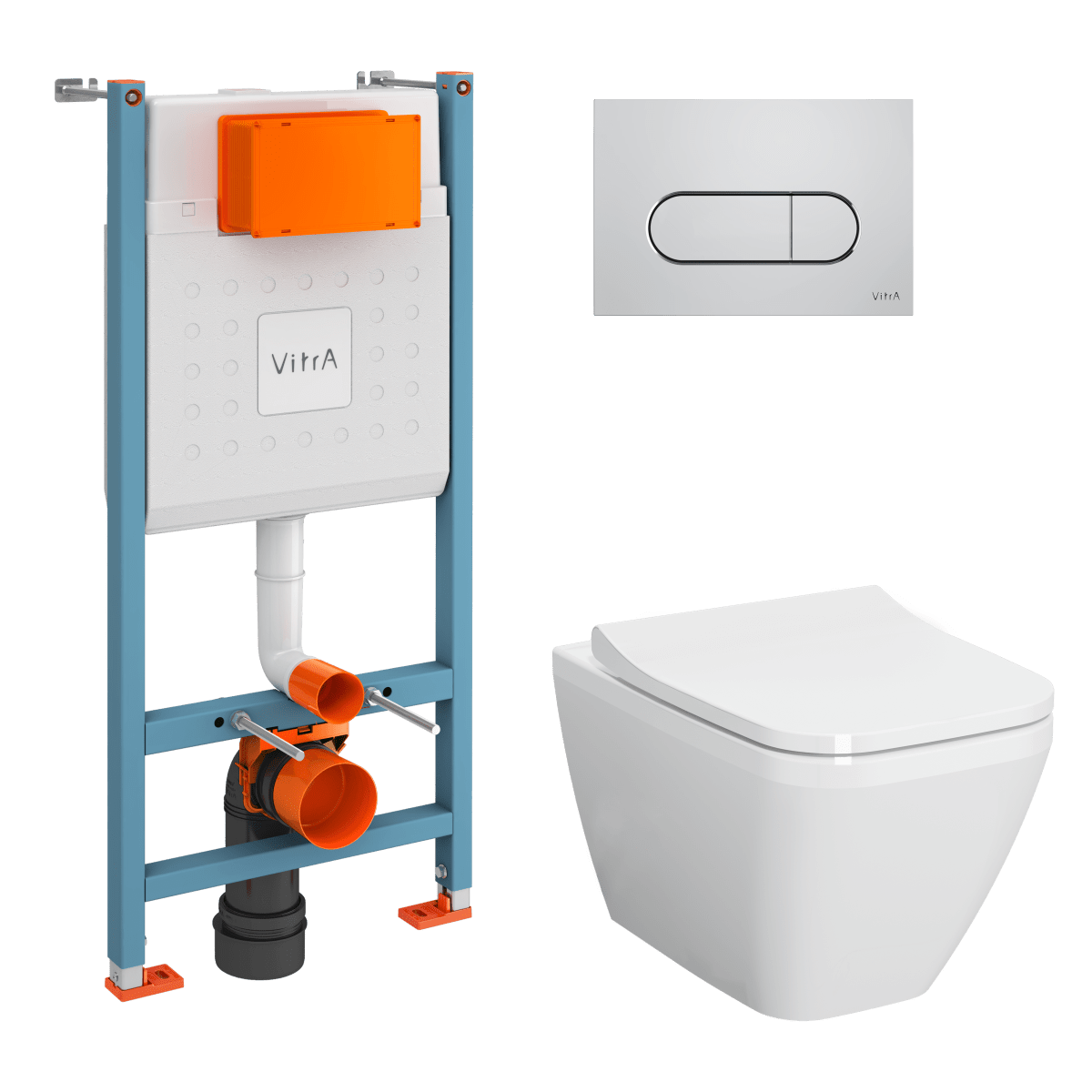 Комплект унитаза с инсталляцией Integra Square глубина унитаза 54см, клавиша хром глянец, с микролифтом, безободковый, Vitra