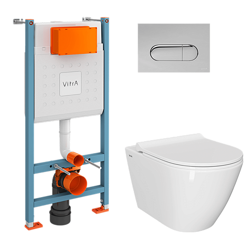 Sanibelle, комплект унитаза с инсталляцией, глубина унитаза 54см, клавиша хром глянец, с микролифтом, безободковый, арт. 9878B003-7200, Vitra