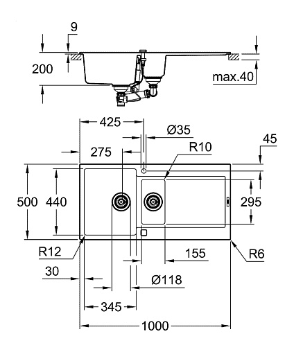 Кухонная мойка K500 50х100 см, гранит, 1.5 чаши, чёрная, Grohe