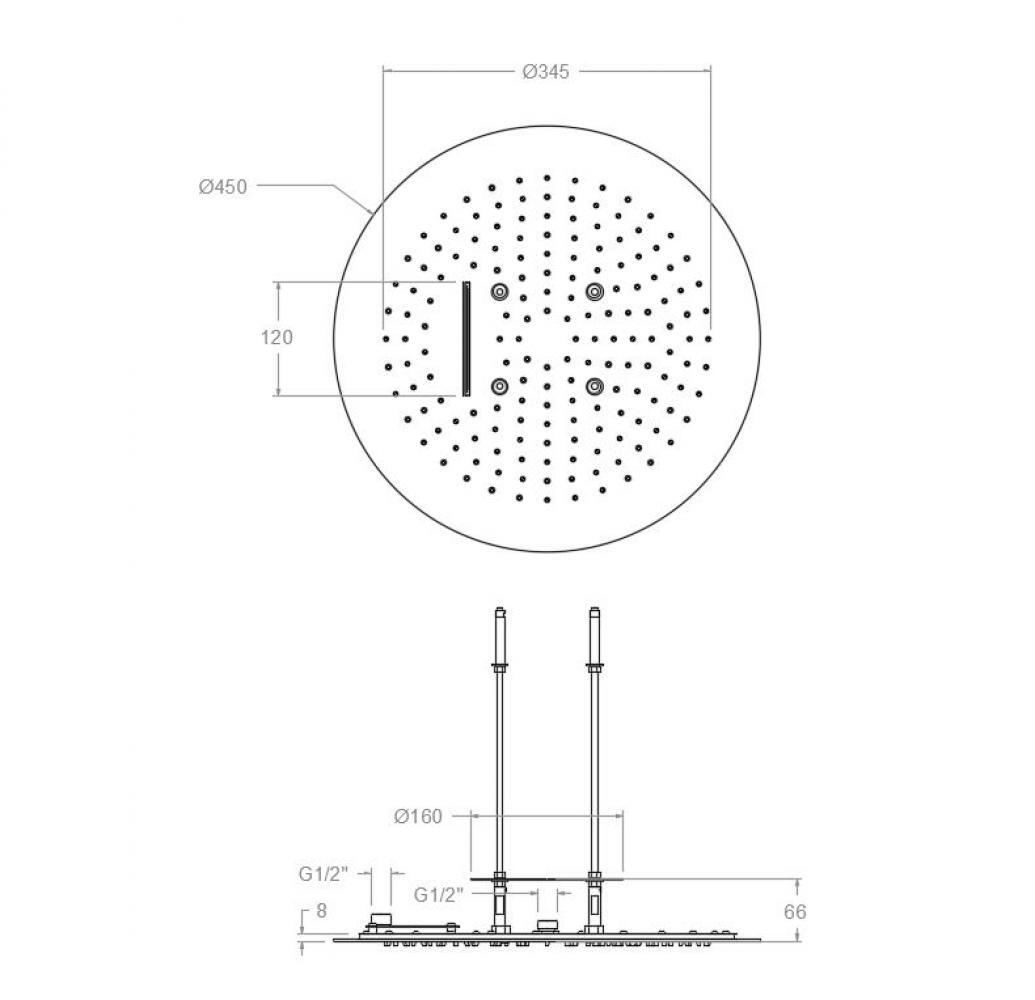 Hydrotherapy, лейка верхнего душа, 45 см, round, без держателя, тропический душ + водопад, встраиваемая в потолок, арт. RE2450, Ramon Soler