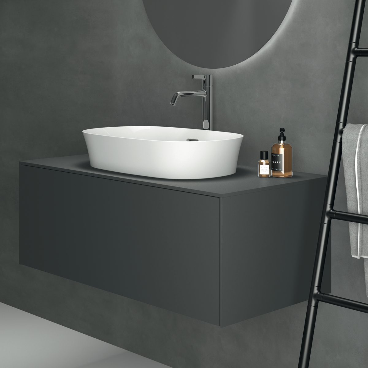 CONCA Тумба 100 см для раковины, центральный вырез в столешнице. Комбинированная система для удобного использования (открытие "Push to open" + закрытие "Soft close"). Внутренняя отделка ящиков цвета антрацит. 1 ящик. Рекомендуется сифон Space Saving EE23033967 (заказывается дополнительно). Для монтажа с раковинами Conca 40/50/60/80 см (с шлифованной нижней поверхностью) или Conca vessel 45/60 см или Extra 45/50/60/70/80 см (с шлифованной нижней поверхностью) или Extra vessel 50/60 см или Ipalyss vessel 40/55/60/65/80 см или Linda-X 50/60/75 см (с шлифованной нижней поверхностью)