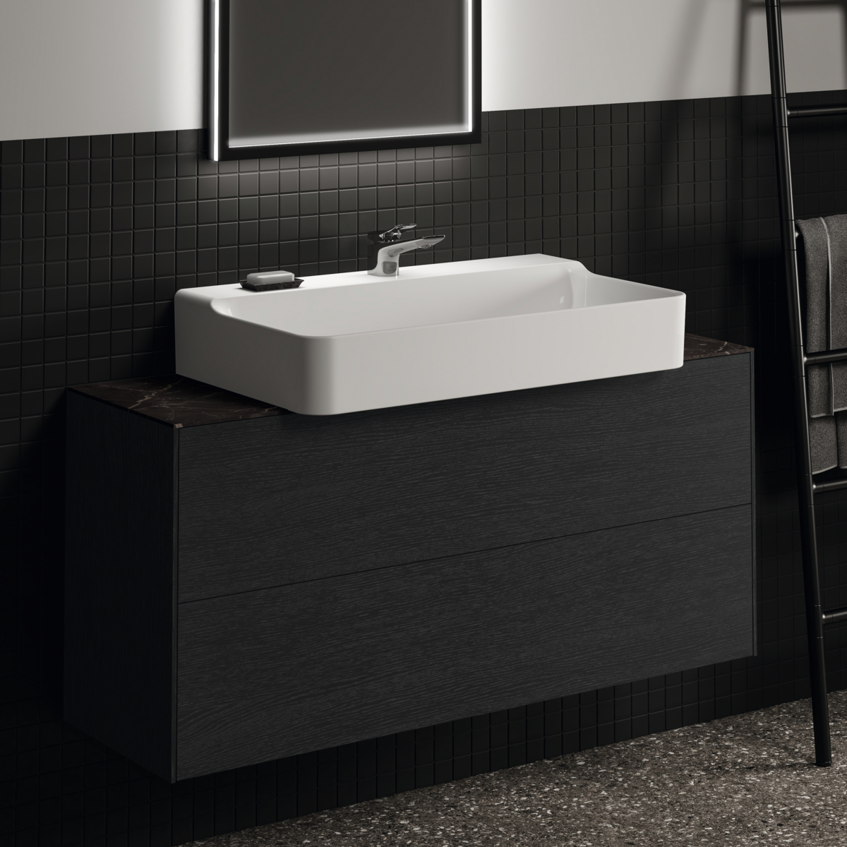 CONCA Тумба 120 см для раковины, узкая проекция 37 см, без столешницы. Комбинированная система для удобного использования (открытие "Push to open" + закрытие "Soft close"). Внутренняя отделка ящиков цвета антрацит. 2 внешних ящика. Для монтажа со столешницей из литьевого мрамора (без выреза / вырез под заказ) 120 см T4347.