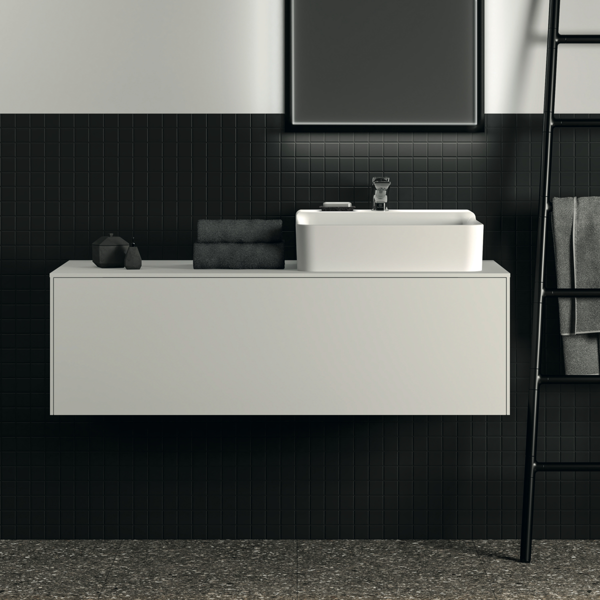 CONCA Тумба 120 см для раковины (вырез в столешнице под заказ). Комбинированная система для удобного использования (открытие "Push to open" + закрытие "Soft close"). Внутренняя отделка ящиков цвета антрацит. 1 ящик.