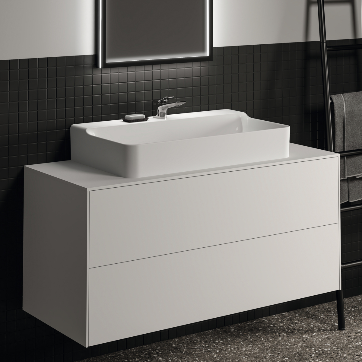 CONCA Тумба 120 см для раковины, центральный вырез в столешнице. Комбинированная система для удобного использования (открытие "Push to open" + закрытие "Soft close"). Внутренняя отделка ящиков цвета антрацит. 2 ящика. Для монтажа с раковинами Conca 40/50/60/80/100 см (с шлифованной нижней поверхностью) или Conca vessel 45/60 см или Extra 45/50/60/70/80/100 см (с шлифованной нижней поверхностью) или Extra vessel 50/60 см или Ipalyss vessel 40/55/60/65/80 см или Linda-X 50/60/75 см (с шлифованной нижней поверхностью)