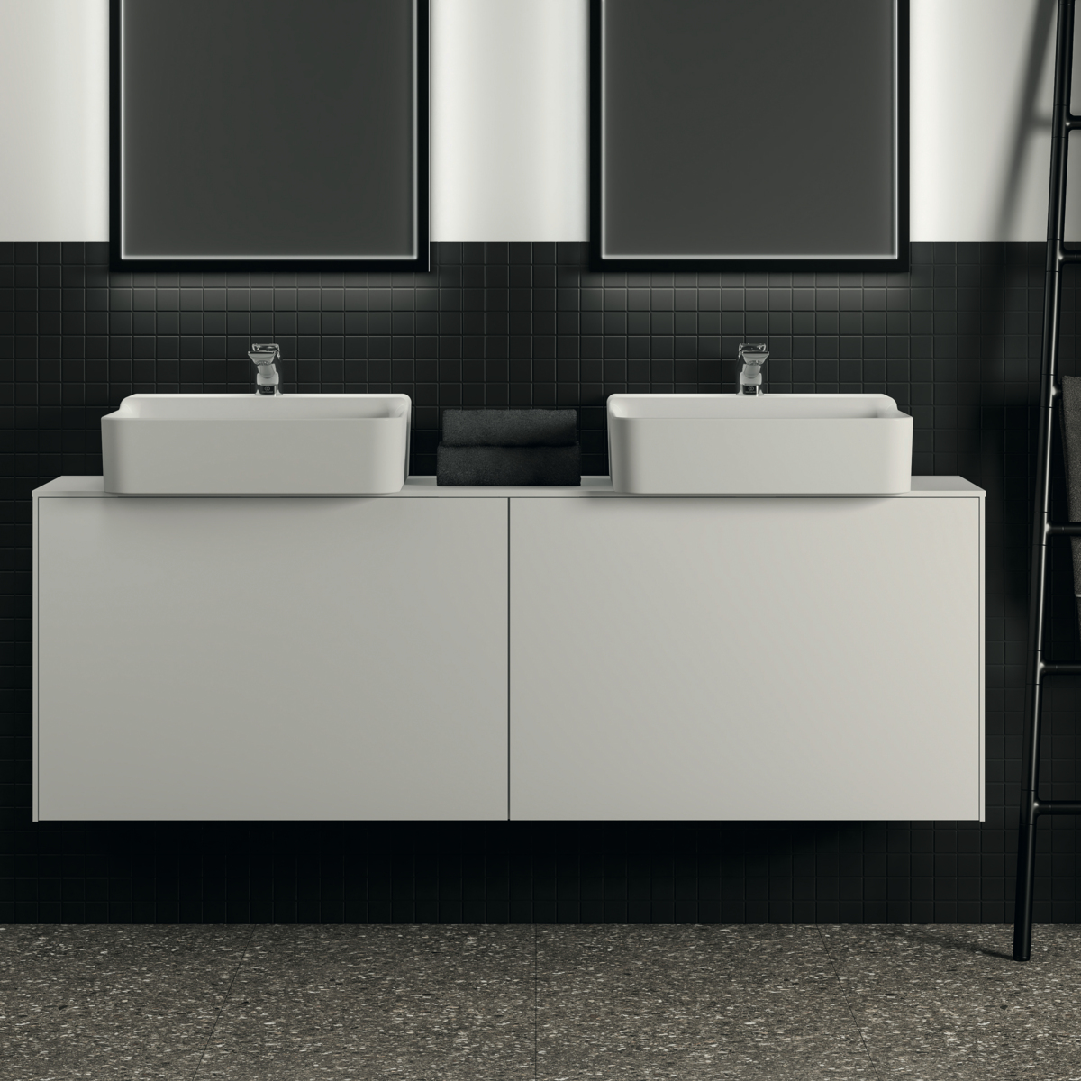 CONCA Тумба 160 см для раковины, узкая проекция 37 см, со столешницей (вырез под заказ). Комбинированная система для удобного использования (открытие "Push to open" + закрытие "Soft close"). Внутренняя отделка ящиков цвета антрацит. 2 внешних и 2 внутренних ящика