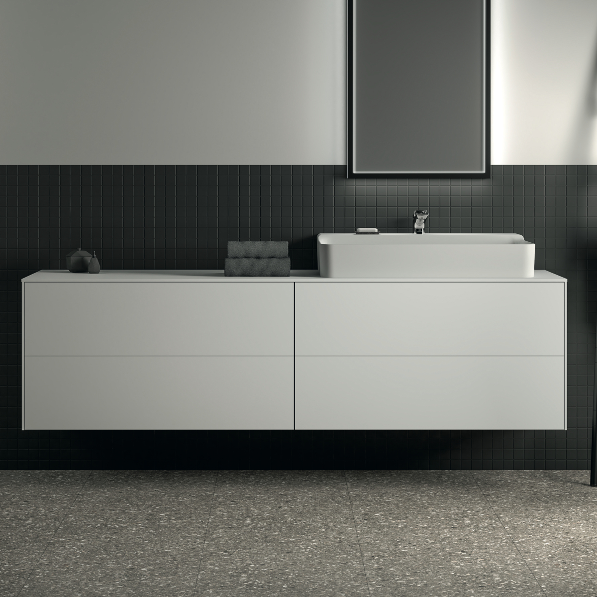 CONCA Тумба 200 см для раковины, со столешницей (вырез под заказ). Комбинированная система для удобного использования (открытие "Push to open" + закрытие "Soft close"). Внутренняя отделка ящиков цвета антрацит. 4 ящика