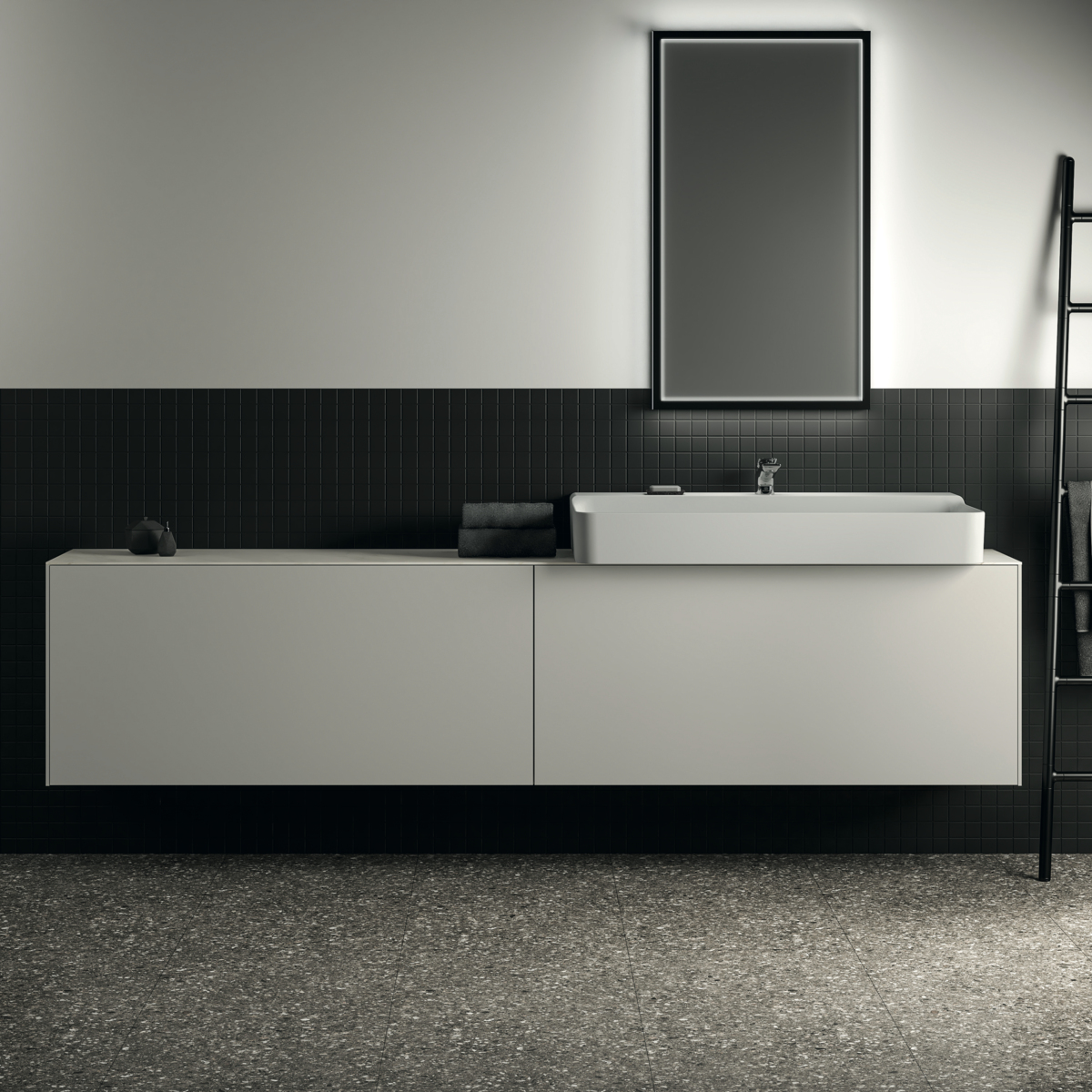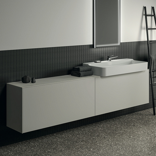 CONCA Тумба 240 см для раковины, узкая проекция 37 см, без столешницы. Комбинированная система для удобного использования (открытие "Push to open" + закрытие "Soft close"). Внутренняя отделка ящиков цвета антрацит. 2 внешних и 2 внутренних ящика. Для монтажа со столешницей из литьевого мрамора (без выреза / вырез под заказ) 240 см T4350