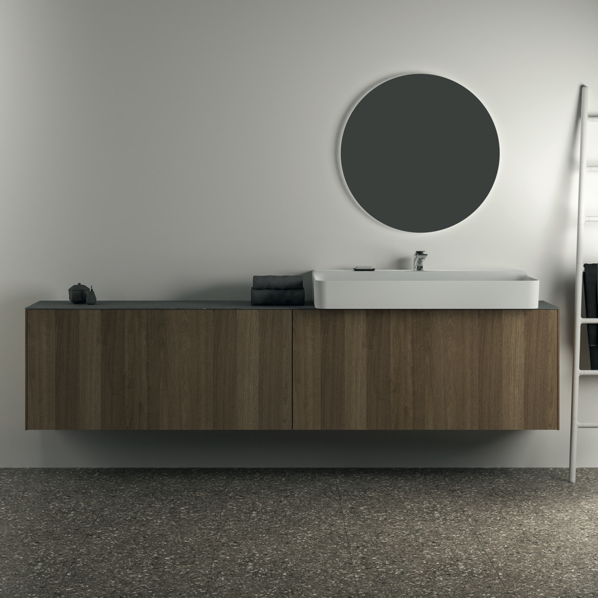 CONCA Тумба 240 см для раковины, узкая проекция 37 см, без столешницы. Комбинированная система для удобного использования (открытие "Push to open" + закрытие "Soft close"). Внутренняя отделка ящиков цвета антрацит. 2 внешних и 2 внутренних ящика. Для монтажа со столешницей из литьевого мрамора (без выреза / вырез под заказ) 240 см T4350