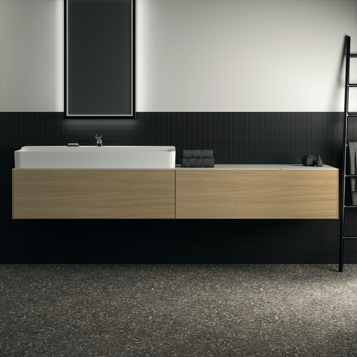 CONCA Тумба 240 см для раковины, без столешницы. Комбинированная система для удобного использования (открытие "Push to open" + закрытие "Soft close"). Внутренняя отделка ящиков цвета антрацит. 2 ящика. Для монтажа со столешницей из литьевого мрамора (без выреза / вырез под заказ) 240 см T4343.