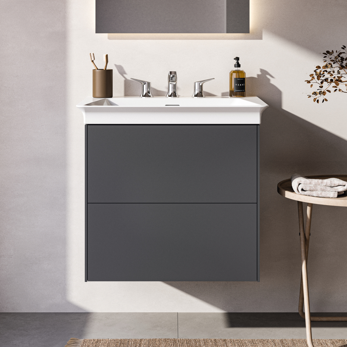 CONCA Тумба без столешницы 60х44 см, комбинированная система для удобного использования (открытие "Push to open" + закрытие "Soft close"). Внутренняя отделка ящиков цвета антрацит. 2 ящика. олнительно). Для монтажа с раковинами La Dolce Vita Symmetrical Vanity 66 см E264401; E270001; E267501 или Extra 60 см T388901; T389101; T389001 или Strada II Vanity 64 см T299101; T363301 или Connect Air Vanity 64 см E028901 или Tesi Vanity 62,5 см T351001 или I.Life A Vanity 64 см T461901 или Eurovit Vanity 61 см E066801