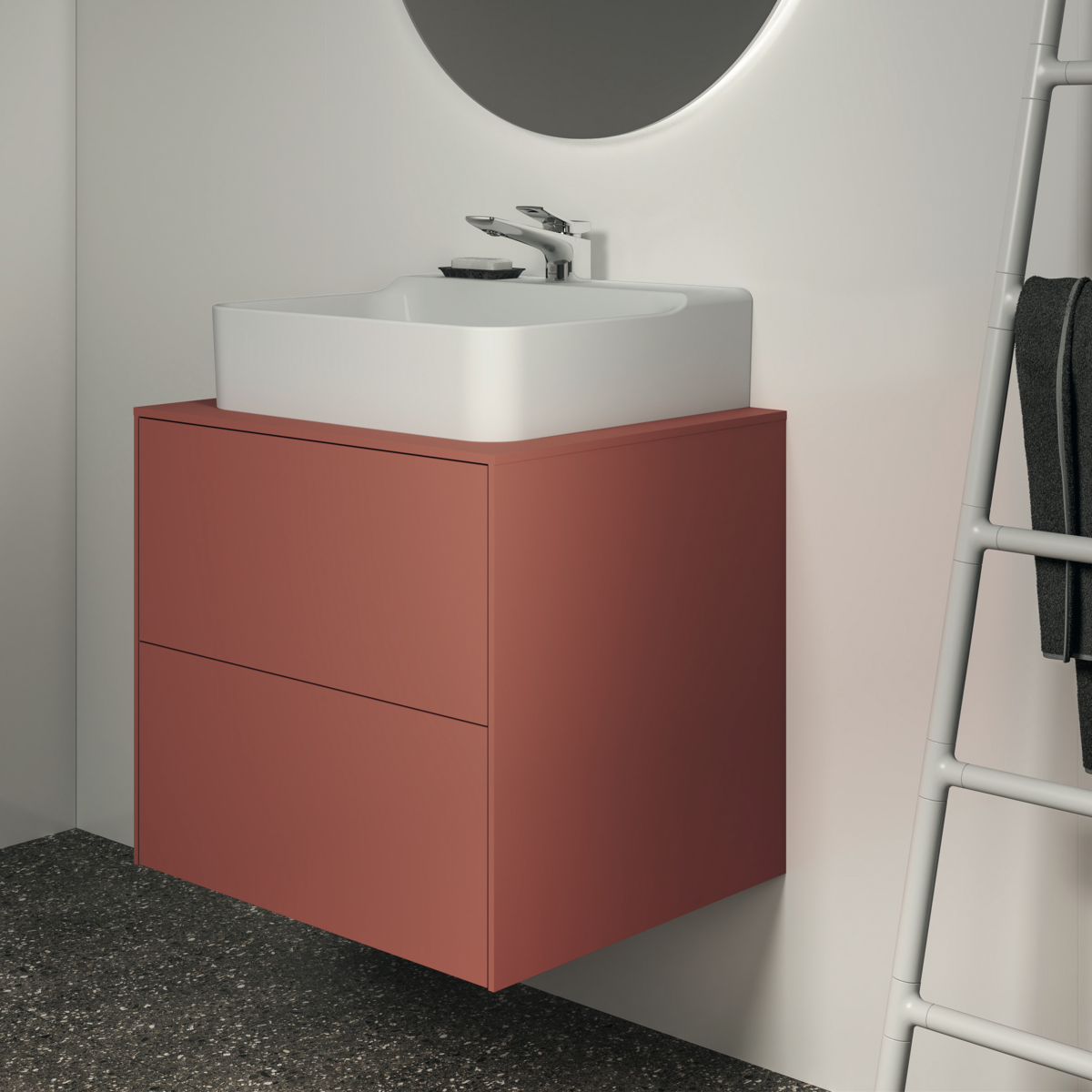 CONCA Тумба 60 см для раковины, центральный вырез в столешнице. Комбинированная система для удобного использования (открытие "Push to open" + закрытие "Soft close"). Внутренняя отделка ящиков цвета антрацит. 2 ящика. Для монтажа с раковинами Conca 40/50 см (с шлифованной нижней поверхностью) или Conca vessel 45 см или Extra 45/50 см (с шлифованной нижней поверхностью) или Extra vessel 50 см или Ipalyss vessel 40/55/60 см или Linda-X 50/60 см (с шлифованной нижней поверхностью)