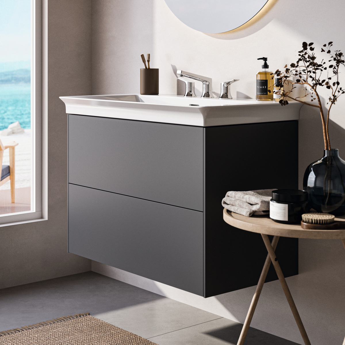 CONCA Тумба без столешницы 80х44 см, комбинированная система для удобного использования (открытие "Push to open" + закрытие "Soft close"). Внутренняя отделка ящиков цвета антрацит. 2 ящика. Для монтажа с раковинами La Dolce Vita Symmetrical Vanity 86 см E262901; E270101; E267601 или Extra 80 см T389901; T390101; T390001 или Strada II vanity 84 см T300301; T363401 или Connect Air Vanity 84 см E027901 или Tesi Vanity 82,5 см T350901 или I.Life A Vanity 84 см T462001 или Eurovit Vanity 81,5 см E066901