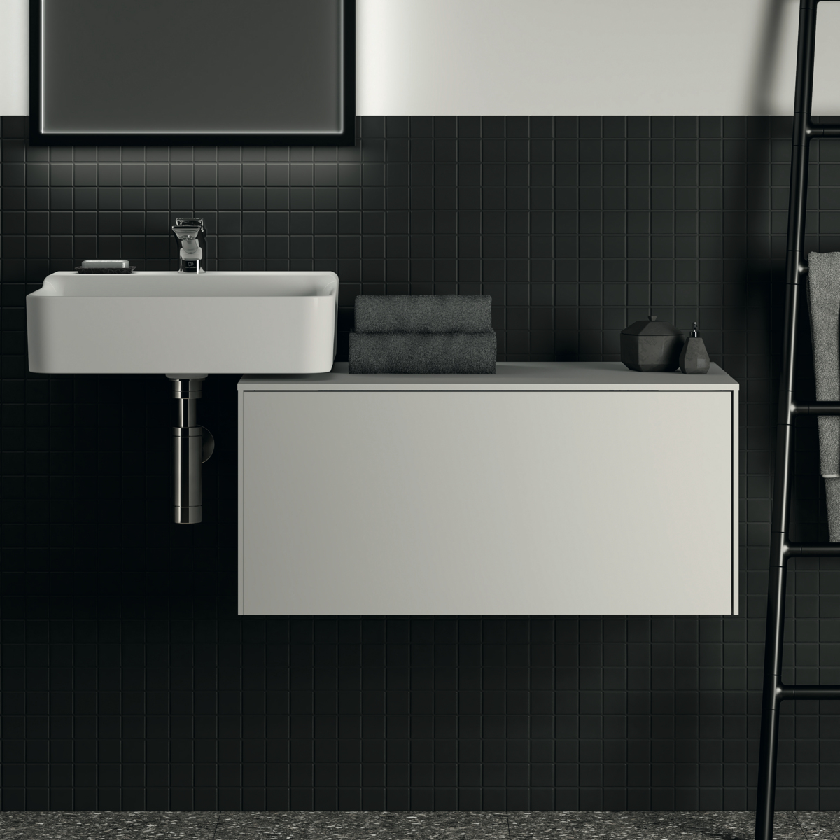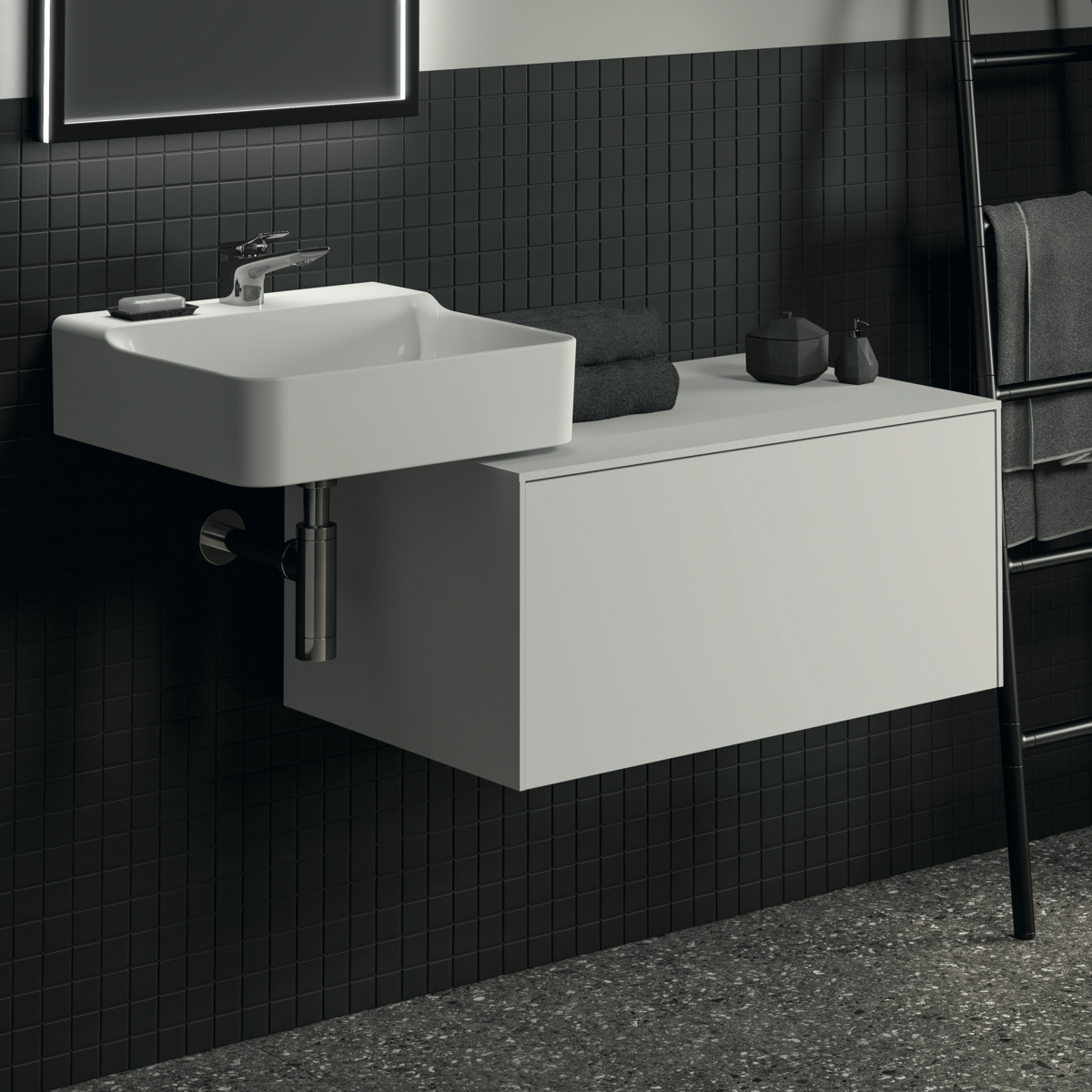 CONCA Тумба 80 см для раковины, без выреза в столешнице. Комбинированная система для удобного использования (открытие "Push to open" + закрытие "Soft close"). Внутренняя отделка ящиков цвета антрацит. 1 ящик. Для монтажа с раковинами Conca 40/50/60 см (с шлифованной нижней поверхностью) или Conca vessel 45/60 см или Extra 45/50/60/70 см (с шлифованной нижней поверхностью) или Extra vessel 50/60 см или Ipalyss vessel 40/55/60/65/80 см или Linda-X 50/60/75 см (с шлифованной нижней поверхностью) или Linda-X vessel 45/55 юсм