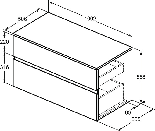 FINESSE Тумба со столешницей 100х50 см для подвесного монтажа, 2 ящика, система плавного закрытия. Конструкция без ручек - паз под верхним и над нижним выдвижными ящиками для легкого открывания. C крепежом. Рекомендуется сифон Space Saving EE23033967 (заказывается дополнительно). Для монтажа с раковинами Linda-X 75 см T4991, T4993, T4992 / Linda-X 60 см T4988, T4990, T4989 / Linda-X 50 см T4985, T4987, T4986 / Conca 80 см T3826, T3828, T3829, T3831, T3827, T3830 / Conca 60 см T3818, T3822, T3823, T3825, T3819, T3824 / Conca 50 см T3812, T3814, T3815, T3817, T3813, T3816 / Conca 40 см T3876, T3877, T3878, T3879 / Extra 80 см T3899, T3901, T3900 / Extra 70 см T3894, T3896, T3895 / Extra 60 см T3889, T3891, T3890 / Extra 50 см T3884, T3886, T3885 / Extra 45 см T3917, T3918 / Extra 45 см T3920, T3921 / Extra 45 см T3923, T3924 / Strada II 80 см T3645 / Strada II 60 см T3644 / Strada II 50 см T3643 / Linda-X T4399, T4400, T4401, T4402 / Ipalyss E1391, E1886, E1887, E1396, E1397, E1398, E1413 / Conca T3696, T3698 / Extra T3740, T3741 / La Dolce Vita E2717 / Strada II T2998, T2999, T2964, T2965, T2966, T2967, T2981, T3604, T2929, T2959, T2961, T2962, T2963 / Strada K0776, K0781, K0816, K0784, K0795 / Connect Air K0833, E0348 / I.Life B T5092, T5091, T5087