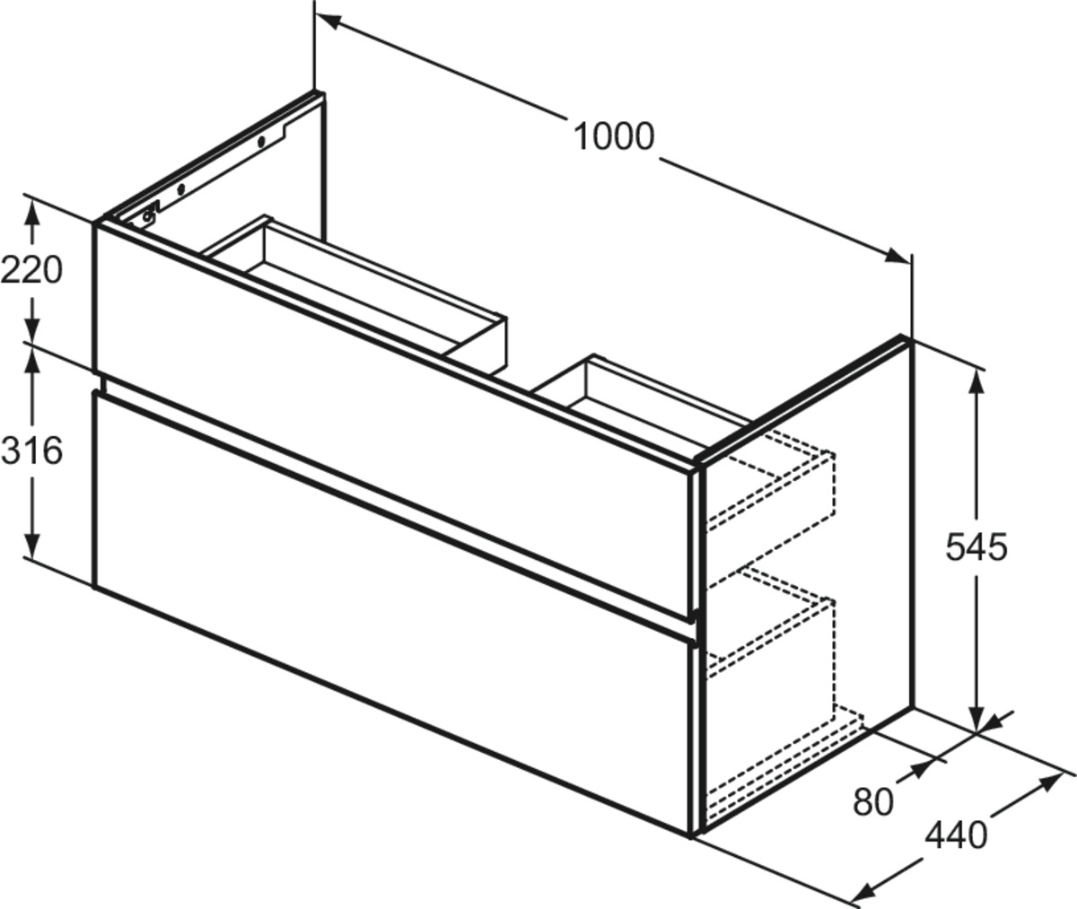 FINESSE Тумба для раковины 100х44 см для подвесного монтажа, 2 ящика, система плавного закрытия. Конструкция без ручек - паз под верхним и над нижним выдвижными ящиками для легкого открывания. C крепежом. Рекомендуется сифон Space Saving EE23033967 (заказывается дополнительно). Для монтажа с раковинами Extra 100 см T3905, T3906, T3908, T3907 или Strada II Vanity 104 см T3004, T3635 или Connect Air Vanity 104 см E0274 или I.Life A Vanity 104 см T4621