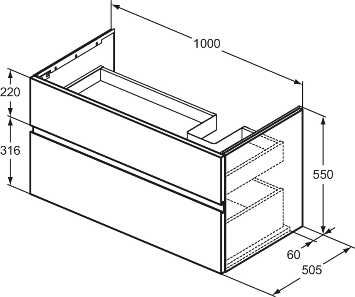 FINESSE Асимметричная тумба для раковины 100х50 см для подвесного монтажа, правая версия, 2 ящика, система плавного закрытия. Конструкция без ручек - паз под верхним и над нижним выдвижными ящиками для легкого открывания. C крепежом. Рекомендуется сифон Space Saving EE23033967 (заказывается дополнительно). Для монтажа с раковинами La Dolce Vita Asymmetrical Right 106 см E2647, E2704, E2679