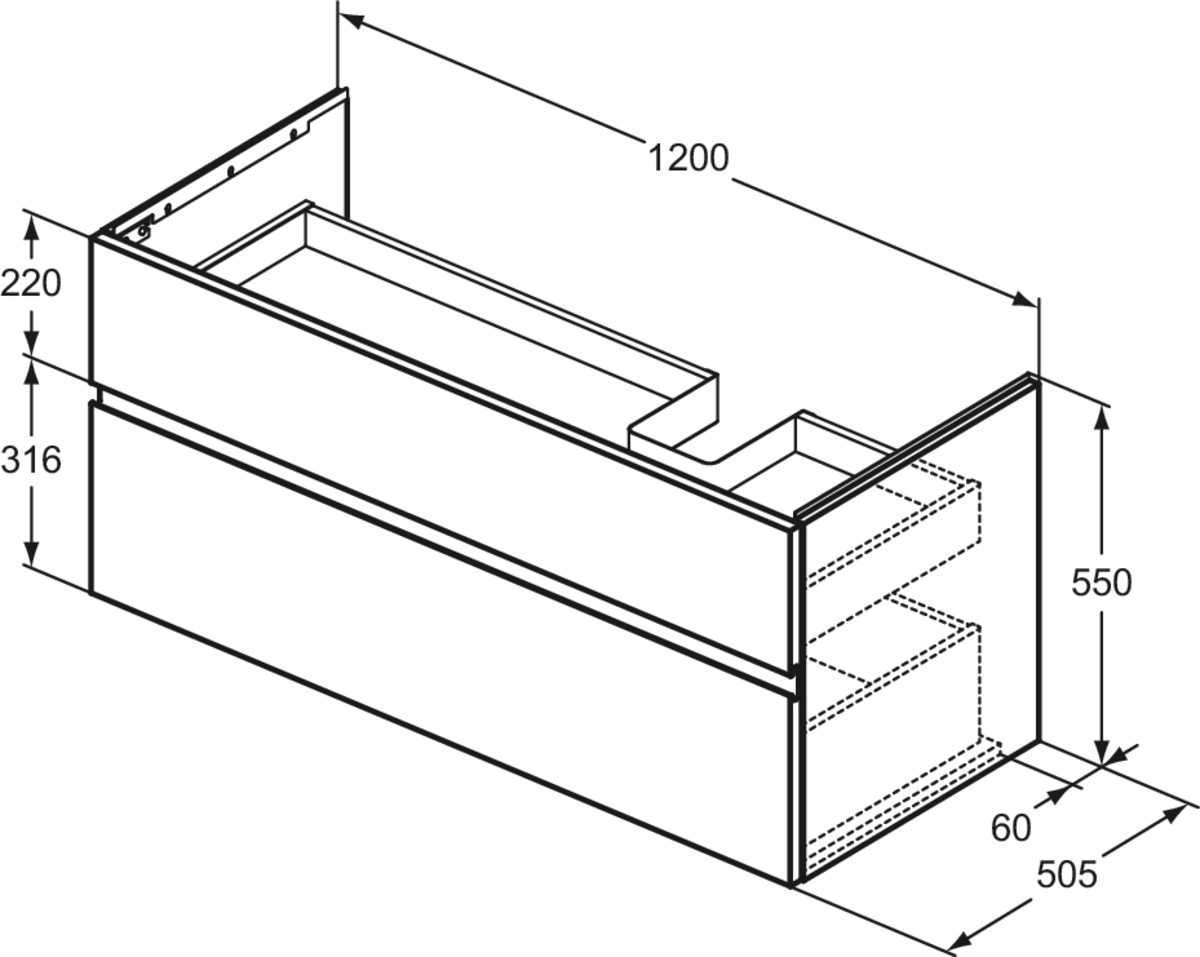 FINESSE Асимметричная тумба для раковины 120х50 см для подвесного монтажа, правая версия, 2 ящика, система плавного закрытия. Конструкция без ручек - паз под верхним и над нижним выдвижными ящиками для легкого открывания. C крепежом. Рекомендуется сифон Space Saving EE23033967 (заказывается дополнительно). Для монтажа с раковинами La Dolce Vita Asymmetrical Right 126 см E2633, E2707, E2697