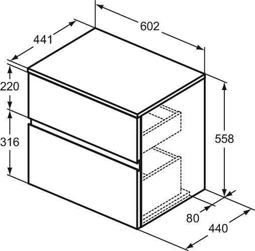 FINESSE Тумба со столешницей 60х44 см для подвесного монтажа, 2 ящика, система плавного закрытия. Конструкция без ручек - паз под верхним и над нижним выдвижными ящиками для легкого открывания. C крепежом. Рекомендуется сифон Space Saving EE23033967 (заказывается дополнительно). Для монтажа с раковинами Linda-X 60 см T4988, T4990, T4989 / Linda-X 50 см T4985, T4987, T4986 / Conca 50 см T3812, T3814, T3815, T3817, T3813, T3816 / Conca 40 см T3876, T3877, T3878, T3879 / Extra 50 см T3884, T3886, T3885 / Extra 45 см T3917, T3918 / Extra 45 см T3920, T3921 / Extra 45 см T3923, T3924 / Strada II 50 см T3643 / Linda-X T4399, T4400, T4401, T4402 / Ipalyss E1396, E1397, E1398, E1413 / Conca T3696 / Extra T3741 / La Dolce Vita E2717 / Strada II T2964, T2965, T2966, T2967, T2981, T3604, T2929, T2959, T2961, T2962, T2963 / Strada K0776, K0816, K0784, K0795 / Connect Air K0833 / I.Life B T5092, T5091, T5087