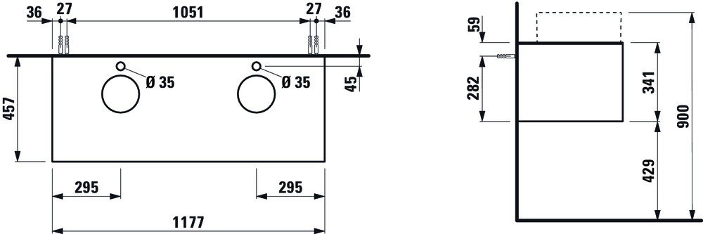 С отверстием для установки раковины справа и слева и с отверстиями для смесителей, для двух раковин.
