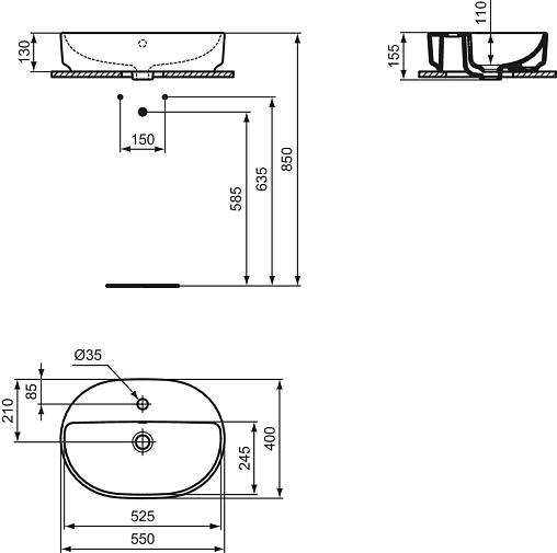 Накладная раковина I.LIFE O 55х40х13 см, санфарфор, с отв. под смеситель, Ideal Standard