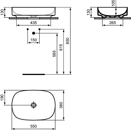 Накладная раковина Linda-X 55х38х13 см, без отверстия перелива, технология Diamatec®, санфарфор, белый матовый, Ideal Standard