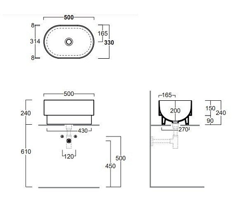 Размер 500*330*240 мм. Монтаж: накладная на столешницу или встраеваемая сверху, без отверстия для смесителя, без перелива.