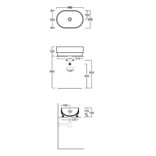 Размер 560*370*190 мм. Монтаж: накладная на столешницу или встраеваемая сверху, без отверстия для смесителя, без перелива