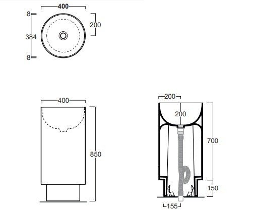Раковина напольная Ø 400 мм (белый глянцевый). Размер 400*400*850 мм. Монтаж: напольная со сливом в пол, без отверстия для смесителя, без перелива.