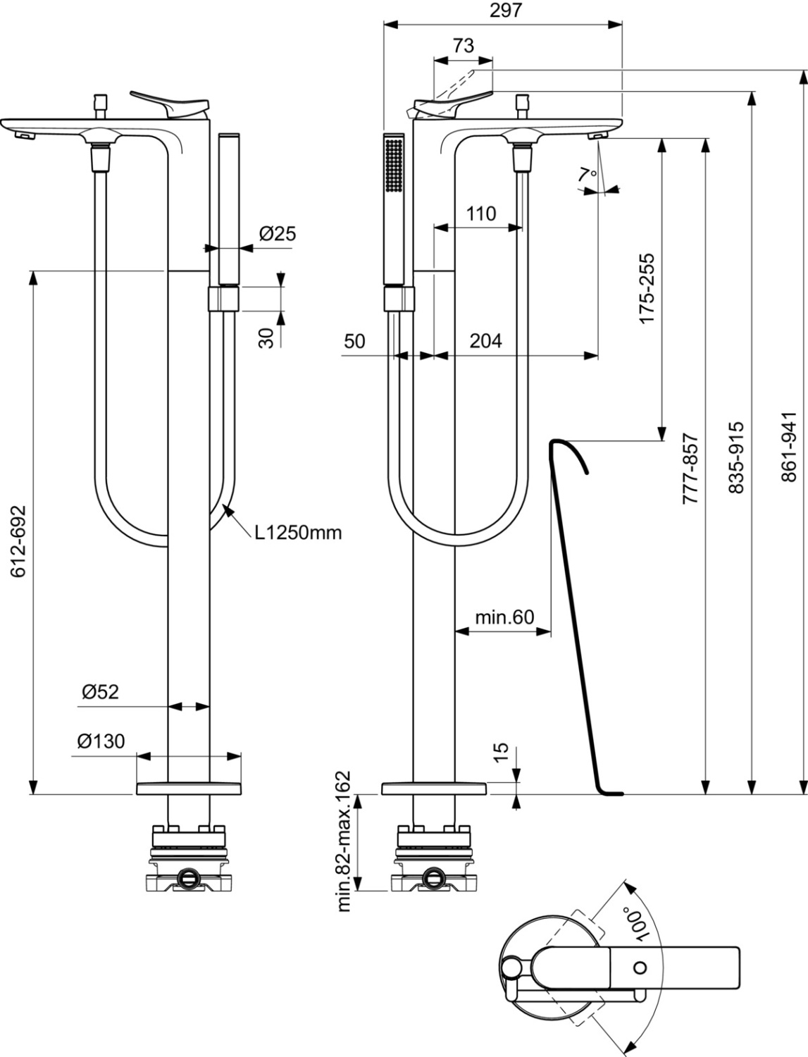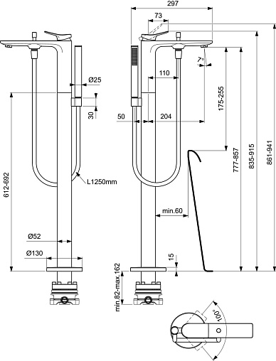 CONCA Однорукоятковый напольный смеситель для ванны/душа, картридж 38 мм FirmaFlow, с функцией HWTC (ограничение максимальной температуры горячей воды), без функции CLICK, латунный корпус, состоящий из 2-х частей, аэратор Coin M24x1, металлическая рукоятка без индикаторов горячей/холодной воды, автоматическое переключение, ручной душ Stick 8 л/мин, шланг для душа Idealflex 1250 мм. Внешняя напольная металлическая накладка. Для монтажа со встраиваемым комплектом A6133NU – вертикально регулируемый и подходящий для встроенной установки для пола 80-160 мм