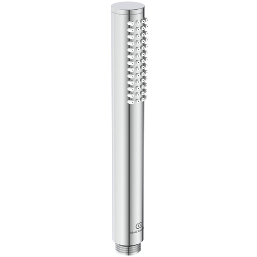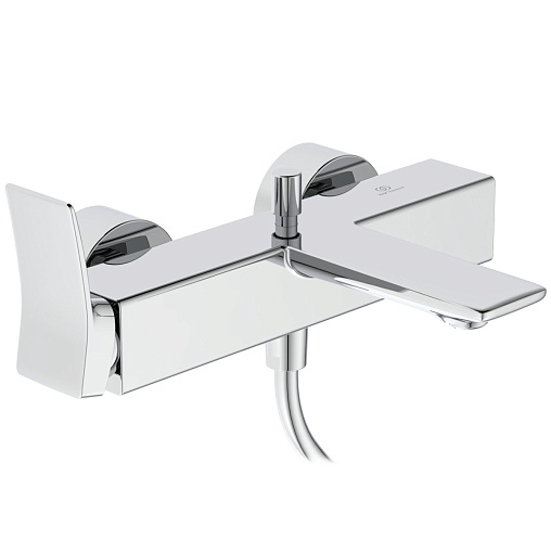 CONCA Настенный смеситель для ванны/душа с душевым комплектом, керамический картридж FirmaFlow 38 мм, с функцией HWTC (ограничение максимальной температуры горячей воды), без функции CLICK, логотип Ideal Standard на корпусе, металлическая рукоятка без индикаторов горячей/холодной воды, обратный клапан, эксцентрики с шумопонижателем, аэратор Coin slot M24x1, автоматическое переключение. Душевой комплект: металлический ручной душ типа Stick с логотипом Ideal Standard, шланг IdealFlex 1600 мм, квадратный держатель для душа