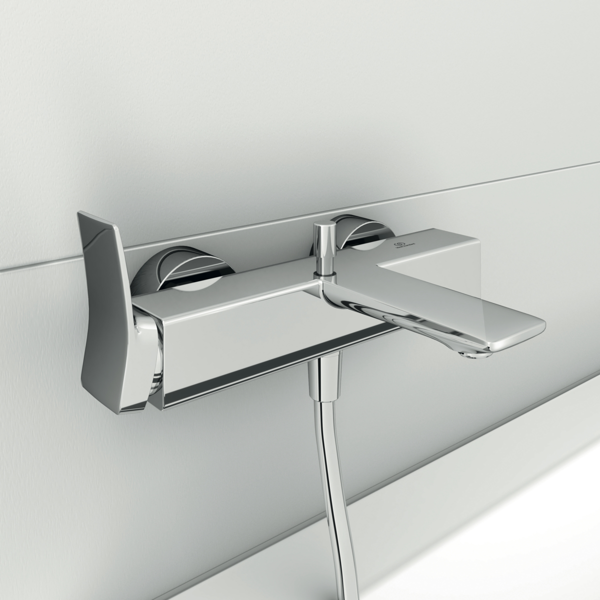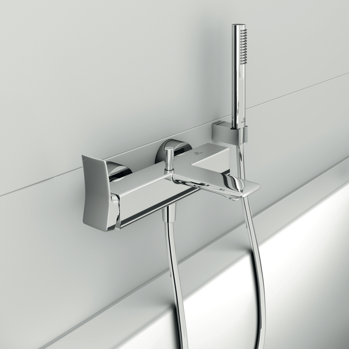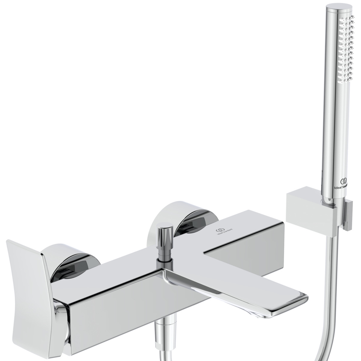 CONCA Настенный смеситель для ванны/душа с душевым комплектом, керамический картридж FirmaFlow 38 мм, с функцией HWTC (ограничение максимальной температуры горячей воды), без функции CLICK, логотип Ideal Standard на корпусе, металлическая рукоятка без индикаторов горячей/холодной воды, обратный клапан, эксцентрики с шумопонижателем, аэратор Coin slot M24x1, автоматическое переключение. Душевой комплект: металлический ручной душ типа Stick с логотипом Ideal Standard, шланг IdealFlex 1600 мм, квадратный держатель для душа