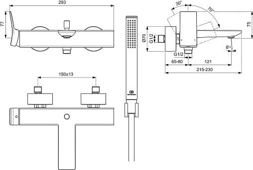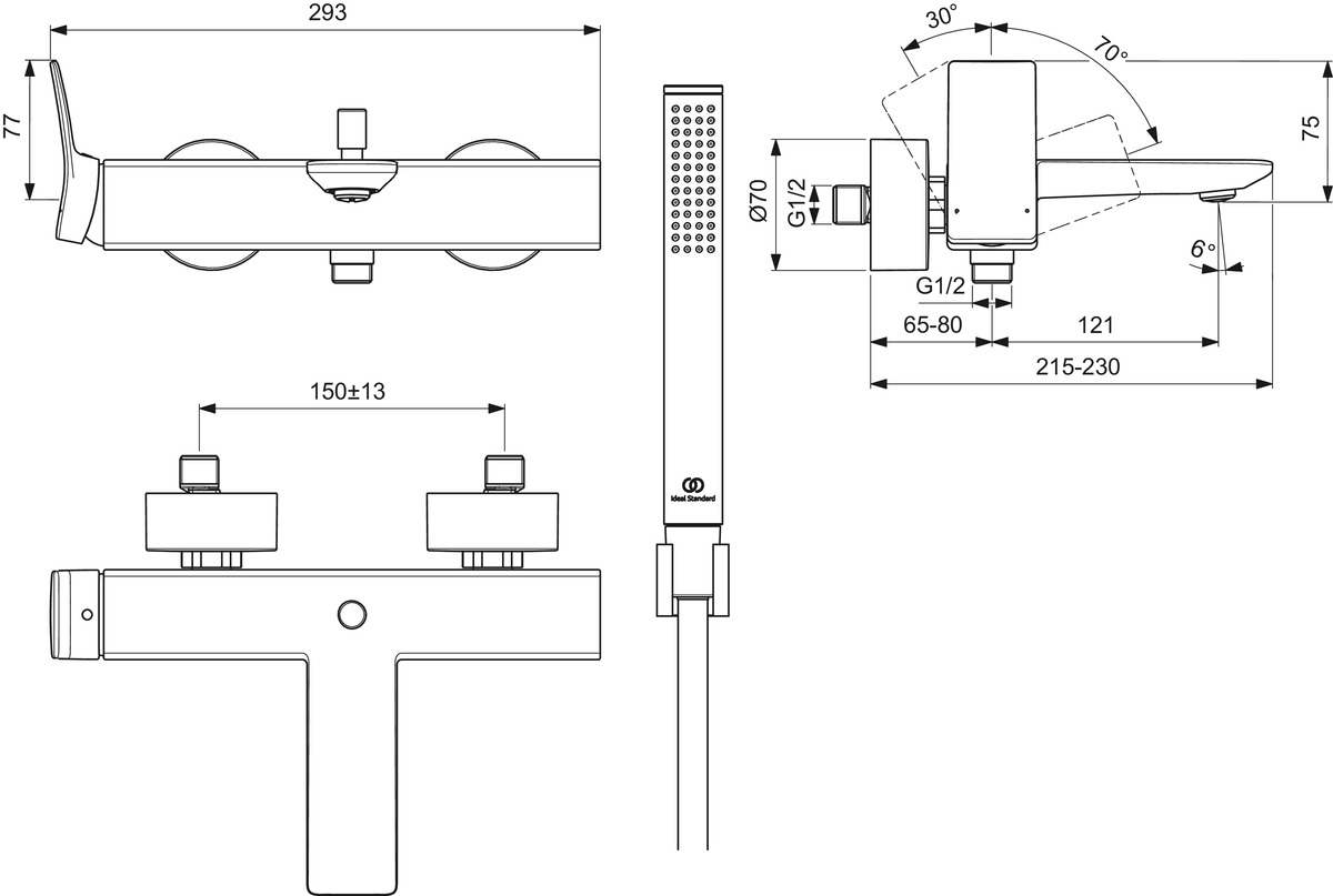 CONCA Настенный смеситель для ванны/душа с душевым комплектом, керамический картридж FirmaFlow 38 мм, с функцией HWTC (ограничение максимальной температуры горячей воды), без функции CLICK, логотип Ideal Standard на корпусе, металлическая рукоятка без индикаторов горячей/холодной воды, обратный клапан, эксцентрики с шумопонижателем, аэратор Coin slot M24x1, автоматическое переключение. Душевой комплект: металлический ручной душ типа Stick с логотипом Ideal Standard, шланг IdealFlex 1600 мм, квадратный держатель для душа. Цветное покрытие - технология PVD