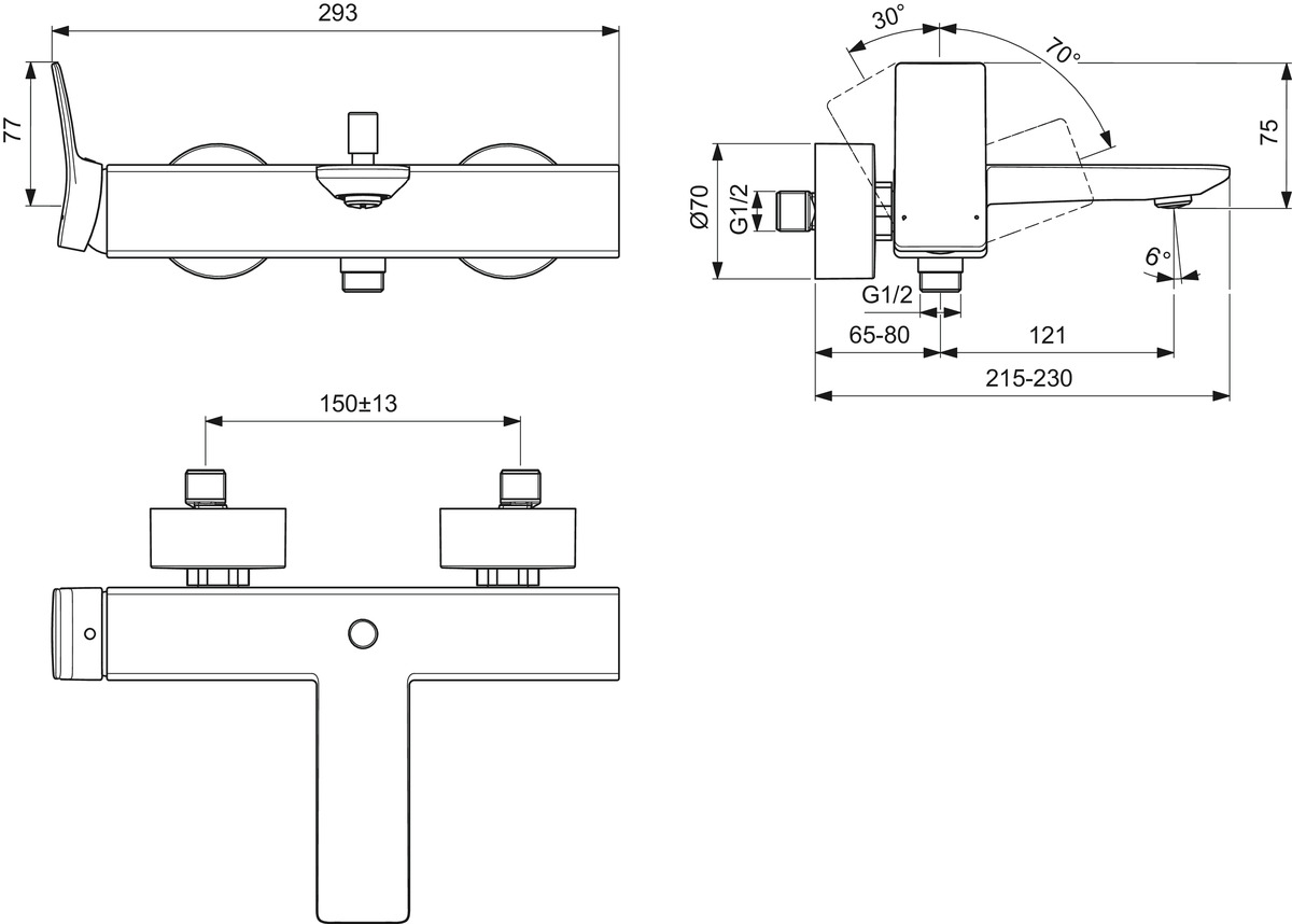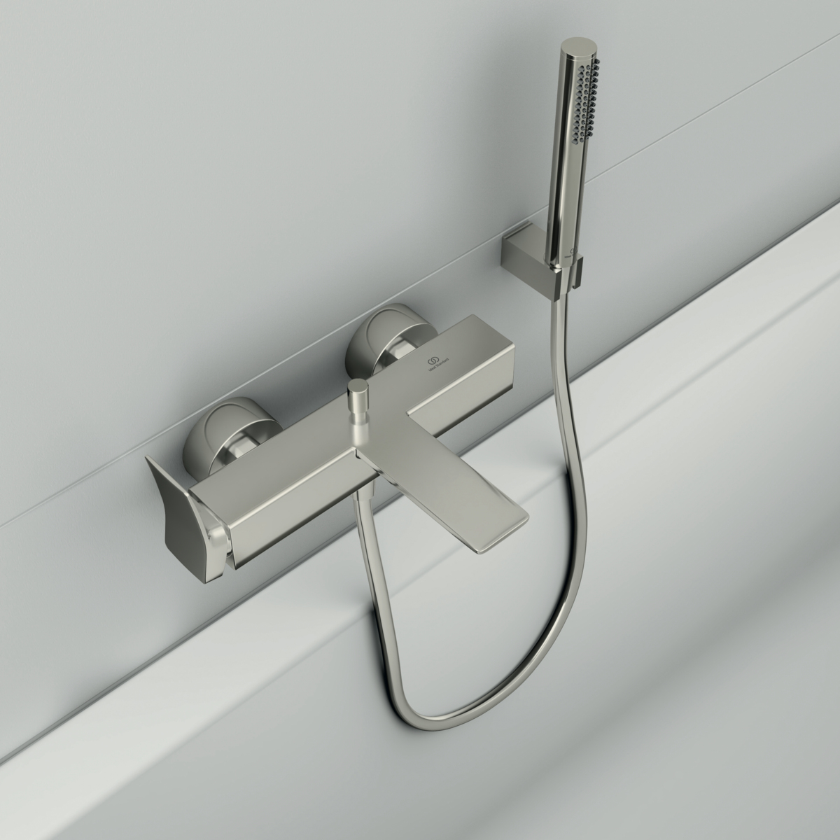 CONCA Настенный смеситель для ванны/душа, керамический картридж FirmaFlow 38 мм, с функцией HWTC (ограничение максимальной температуры горячей воды), без функции CLICK, логотип Ideal Standard на корпусе, металлическая рукоятка без индикаторов горячей/холодной воды, обратный клапан, эксцентрики с шумопонижателем, аэратор Coin slot M24x1, автоматическое переключение. Цветное покрытие - технология PVD