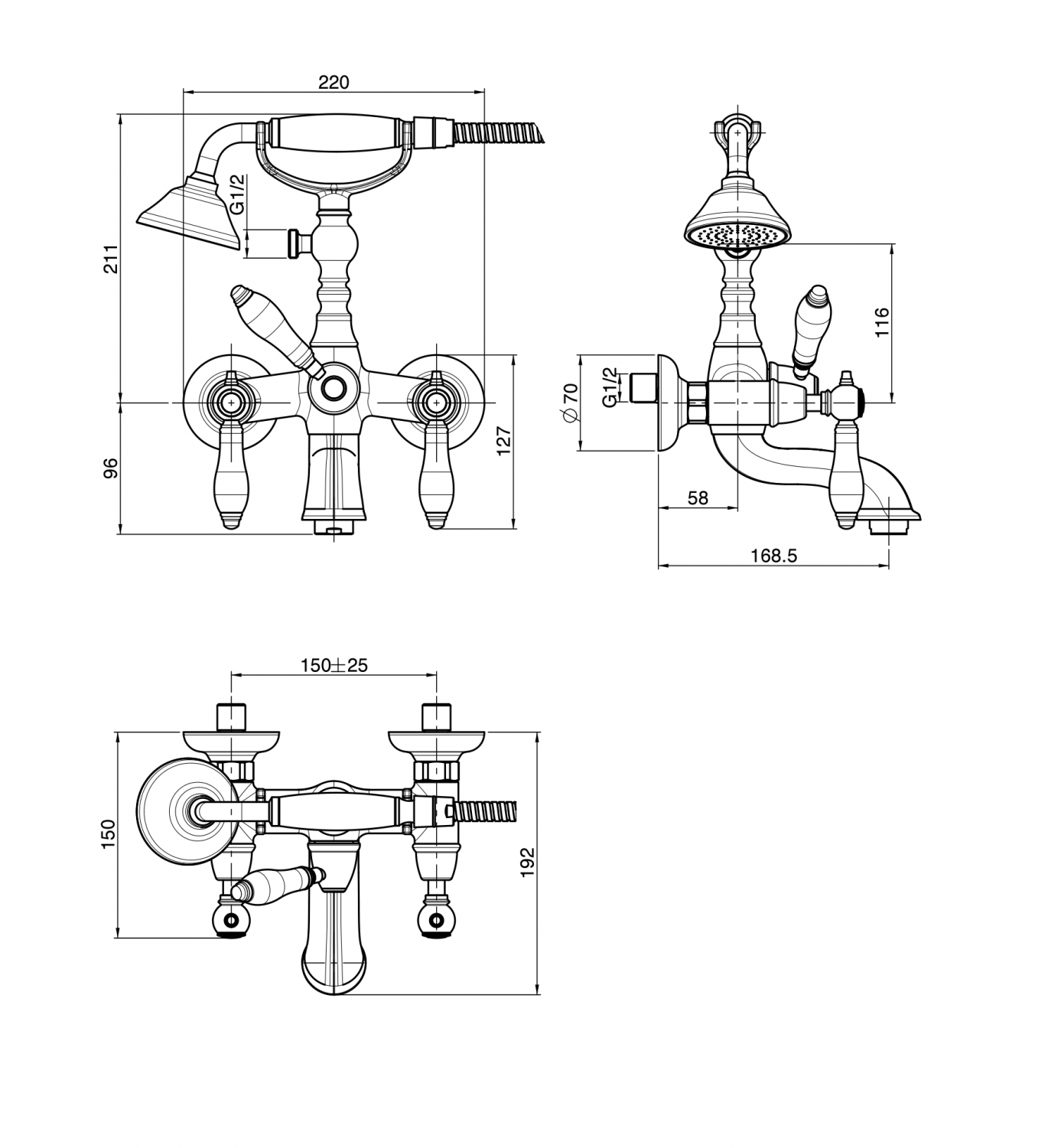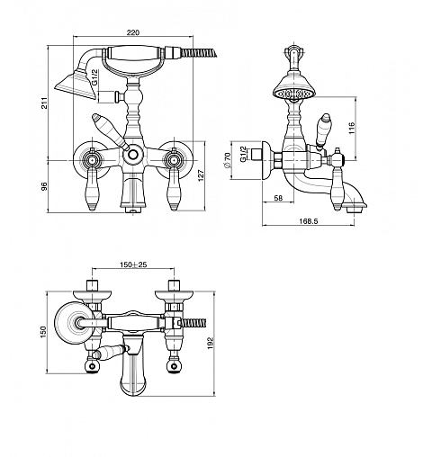 Herend, настенный смеситель, неповоротный излив, лейка в комплекте, шланг 150 см, арт. F5404CR, Fima Carlo Frattini