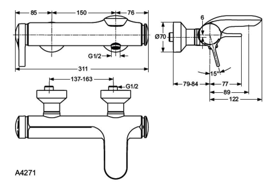 Melange, настенный смеситель, неповоротный излив, без выхода на душ, однорыжачный, арт. A4271AA, Ideal Standard