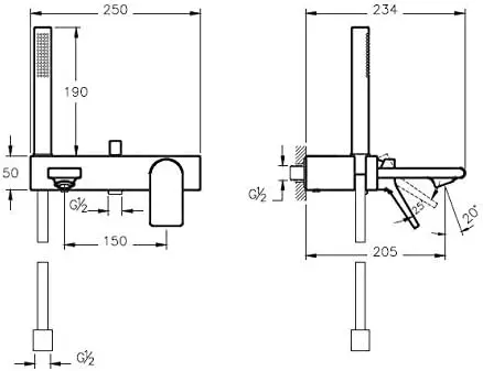 Керамический картридж, монтаж настенный, отверстия для монтажа 2, вынос излива 205 мм, подключение душевого шланга G 1/2". Ручной душ в комплекте