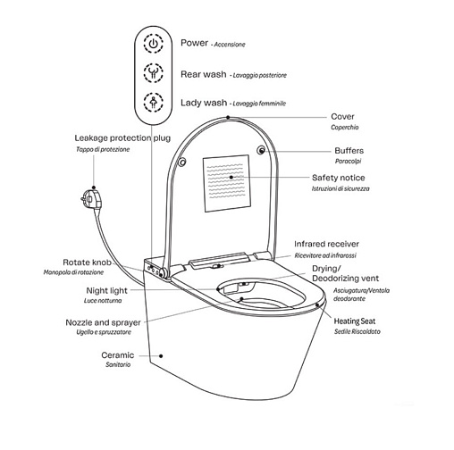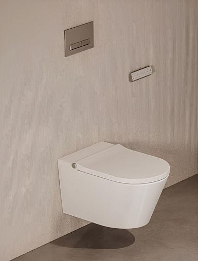 Умный подвесной унитаз компактных размеров (59 см) артикул Y9D301. Помимо классических гигиенических функций с возможностью регулировки интенсивности и температуры водной струи, модель обеспечивает сушку теплым воздухом и дезодорацию. Сидение с подогревом также имеет встроенную подсветку для использования унитаза в ночное время. Модель полностью автоматизирована и все функции управляются с помощью удобного пульта дистанционного управления или с боковой панели.