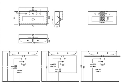 Раковина подвесная или встраиваемая в мебель HATRIA BAHIA_13 BH0800365011TS, одно отверстие для смесителя по центру, с отверстием перелива, размер 80х36.5x13 см, белая.