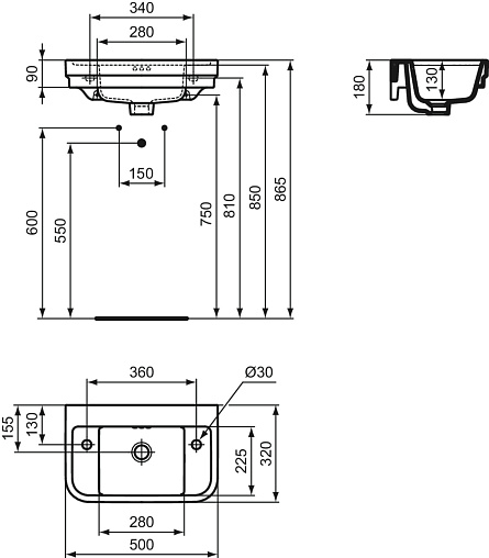 Подвесная раковина Calla 50х32х18 см, отверстия справа и слева, санфарфор, с отв. под смеситель, Ideal Standard