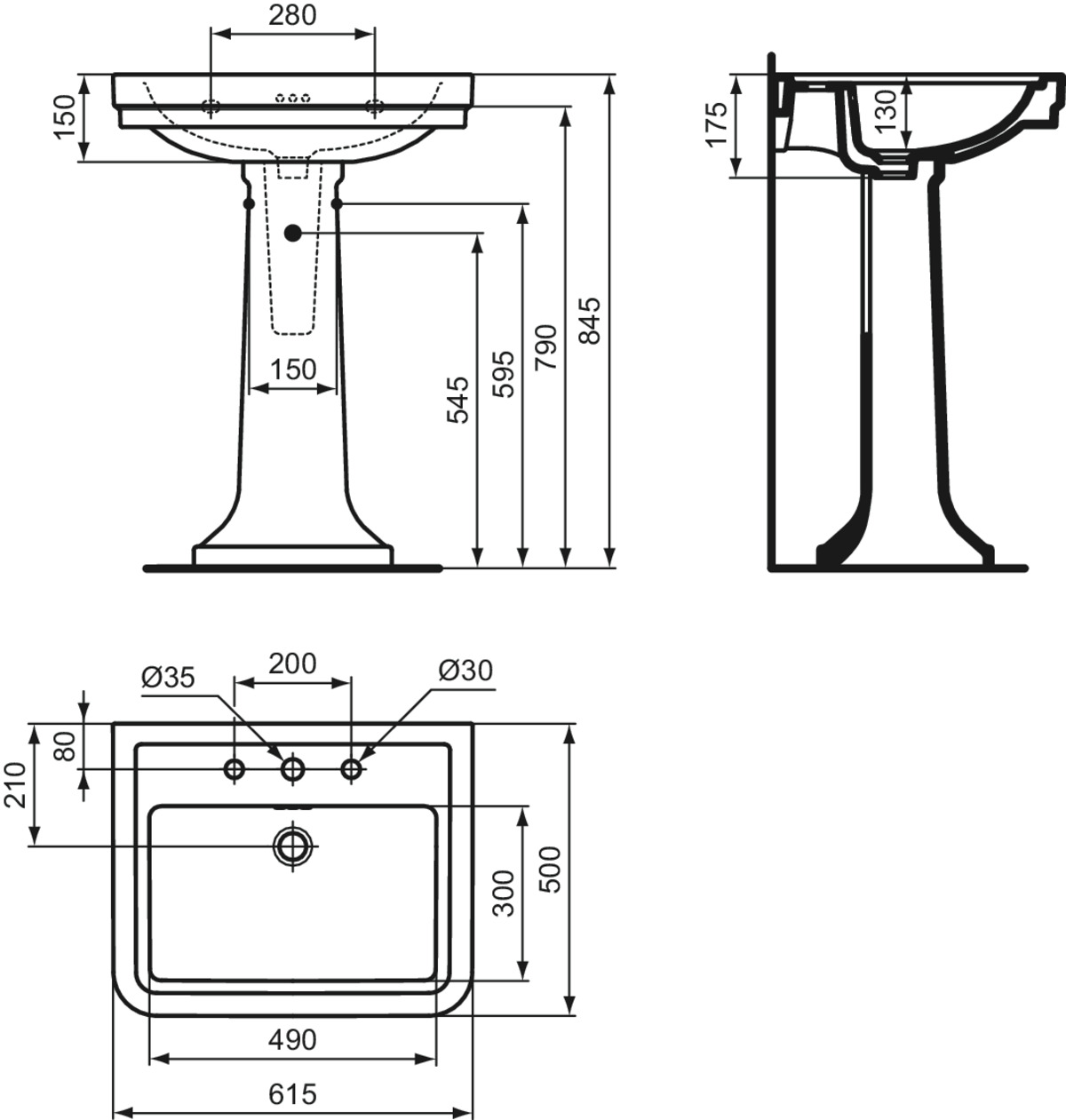 Подвесная раковина Calla 61,5х50х15 см, с 3-мя отверстиями под смеситель, санфарфор, с отв. под смеситель, Ideal Standard