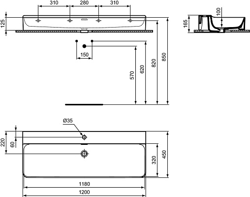 Подвесная раковина Conca 120х45х12,5 см, санфарфор, с отв. под смеситель, Ideal Standard