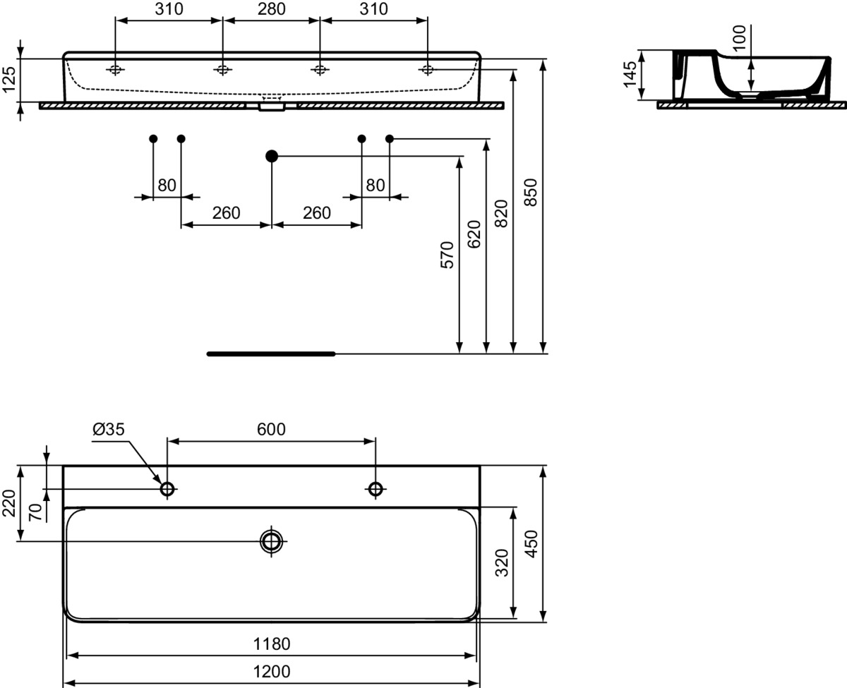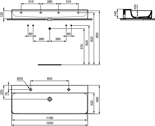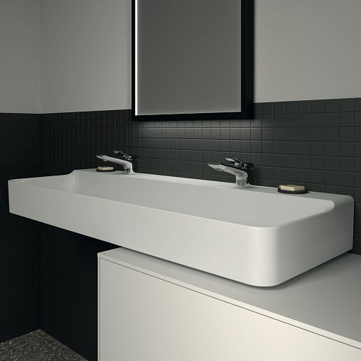 Подвесная раковина Conca 120х45х14,5 см, без отверстия перелива, нижняя поверхность отшлифована, санфарфор, двойная, с отв. под смеситель, Ideal Standard